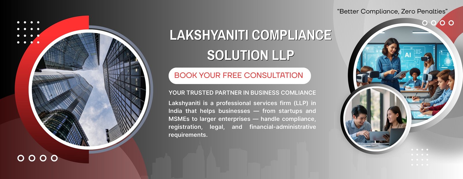 Lakshyaniti Compliance Solution LLP is a trusted and forward-thinking professional services firm committed to simplifying the complex world of legal, financial, and regulatory compliance for Indian businesses. We specialize in providing end-to-end compliance, registration, and advisory services to startups, MSMEs, and well-established enterprises across India.In an evolving business landscape where compliance is not just a requirement but a strategic necessity, Lakshyaniti stands as a dependable partner.